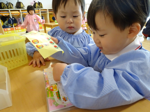 おはようブックにシールをペタリ
