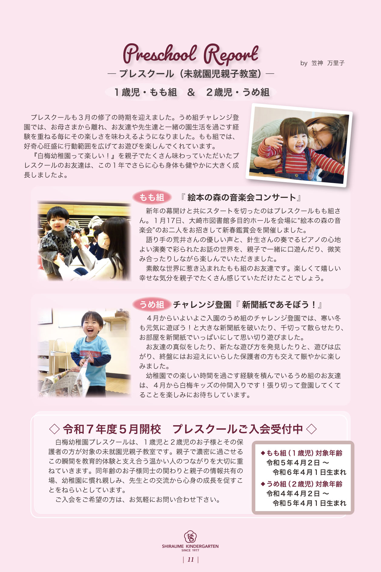 ARCHIVE 2026 2025.03.17 明星vol72_11 PREV 一覧へ戻る NEW 2026.02.27 幼稚園 《転入園相談会》 4/20(月)春の転入… 2026.02.17 未就園児教室 4月8日 春限定ベビ-マッサージ開催 2026.02.02 幼稚園 《0、1歳児 co.u.me cafe未… 2026.01.30 幼稚園 《未就園児対象》3/30 3/31 春の… 2026.01.22 未就園児教室 《未就園児対象》3/26 白梅幼稚園「春… CATEGORY すべて 幼稚園 未就園児教室 ARCHIVE 2026 検索