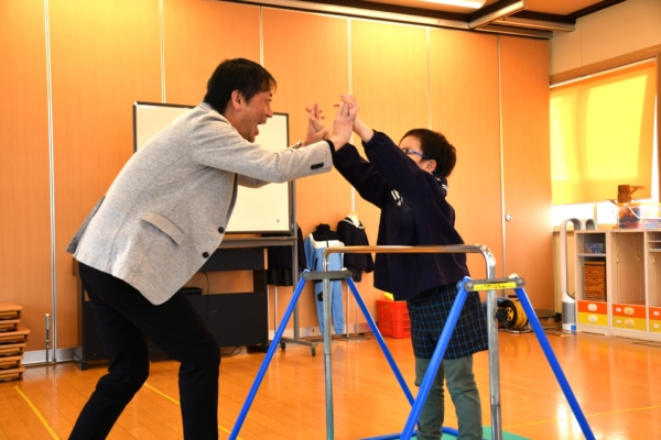 チャレンジを繰り返し 逆上がり初成功のC君とハイタッチ