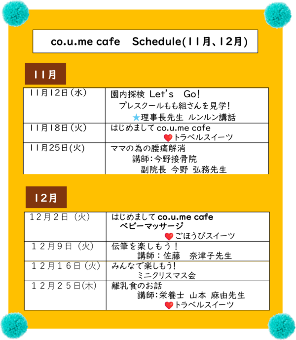 初冬を迎える11月と12月のco.u.me cafe Scheduleを掲載しました。